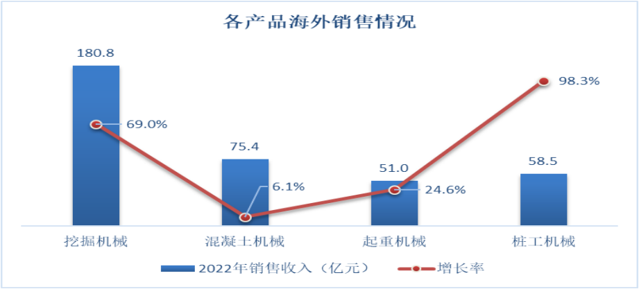 2022年,三一共推出79款符合国际标准的产品,欧美产品覆盖率超70%,助推海外销售额快速增长。挖掘机械、混凝土机械、起重机械在海外市场的销售额分别为180.8亿、75.4亿和51亿元,同比增长69%、6.1%和24.6%。