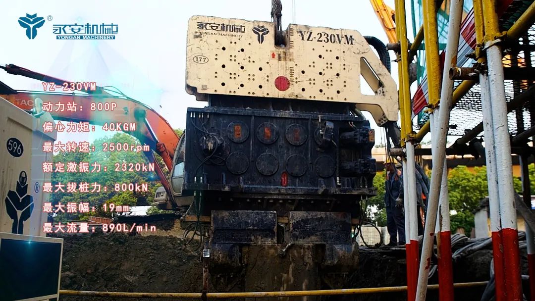 本项目使用永安机械YZ-230VM免共振液压振动锤,该锤采用了超高频率和免共振可调偏心力矩的设计,具备强大的激振力,开机和停机时偏心力矩为零,从而实现免共振功能。该锤增加了减振橡胶,提升了静拔桩力,在桩基施工中通过高频振动,将桩体沉入或拔出土壤,有效降低设备及土壤抖动情况。YZ-230VM安全高效、拔桩力强、绿色环保,拔桩过程中对周边影响很小,适用于市中心、机场、地铁、建筑物旁等复杂的环境施工。