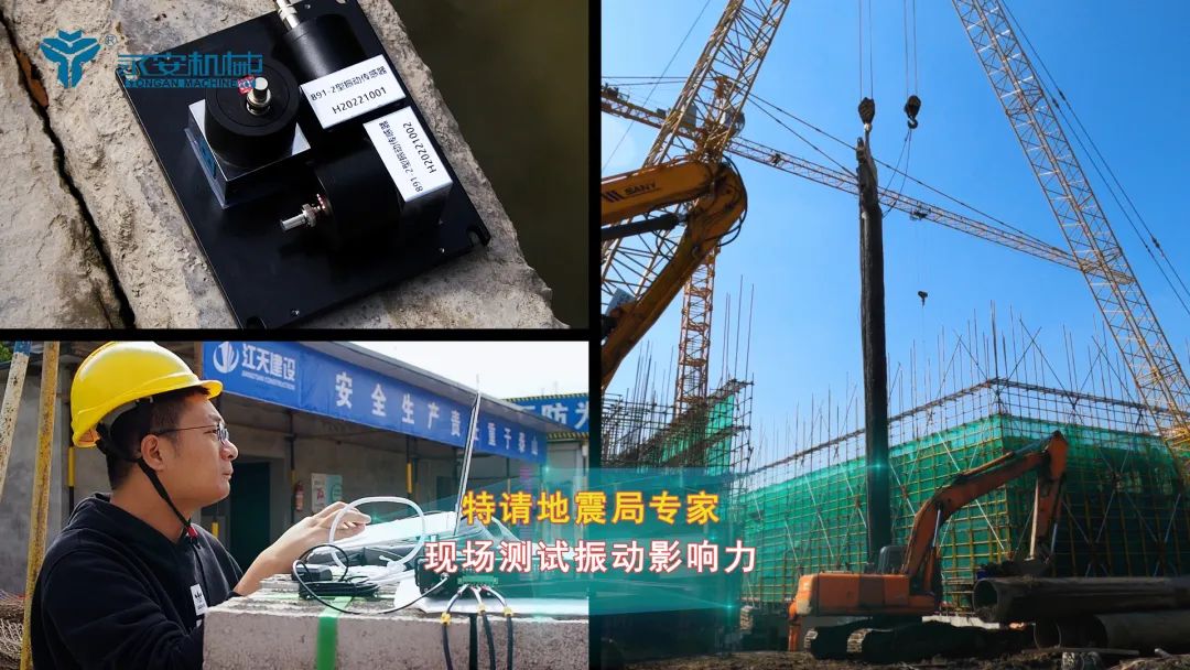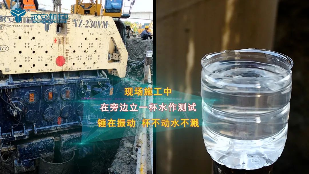 本项目施工中,特意立杯水在YZ-230VM边上做振动测试,沉桩和拔桩时,锤在振动、桩在运动,水杯一点不动,杯中的水也没有溅出来。为了得到更严谨更专业的振动数据,永安机械特请地震局的专家,携带专业的设备到现场测试。