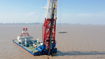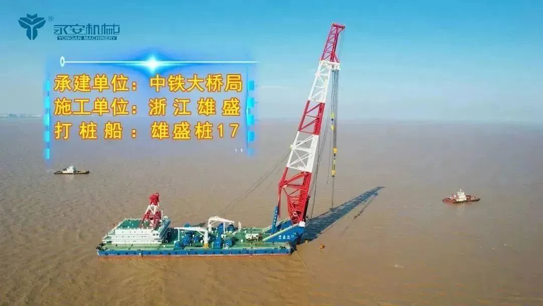 杭州湾是世界三大强潮海湾之一,跨海铁路桥所在位置海域宽、风大、浪高,潮差大、流速大,海床稳定性差,建桥条件恶劣,吊桩地和施工地也不在同一海域,导致施工组织难度大,对承建各方和设备要求极高。项目部和施工方紧密合作,克服各种困难,用雄盛桩17打桩船,挂载永安机械YC-80液压冲击锤打直桩试验桩SZ-1,并顺利打至标位,锤击数3233锤,打击能量645—890KJ。经现场实测,显示能量886KJ,作用在桩身上的有效能量800KJ以上,能量转化率达90%以上。