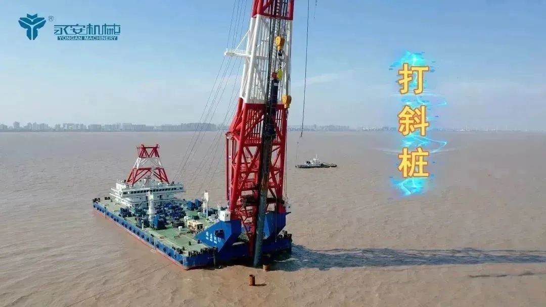 打斜桩承台锚桩施工难度极大,项目部和施工方高度重视,多方领导和专家现场讨论指导施工,通过多方紧密合作,和永安机械YC-80液压冲击锤稳定发挥,并顺利把首根斜桩打至标位,锤击数2045锤,打击能量645—896KJ。