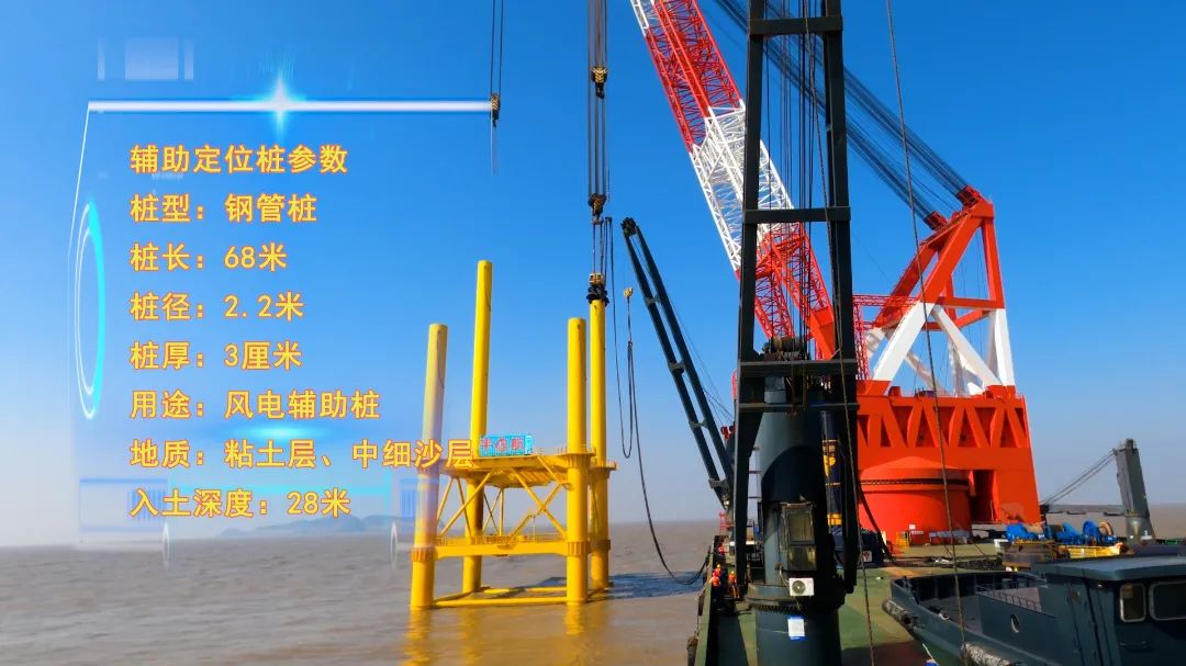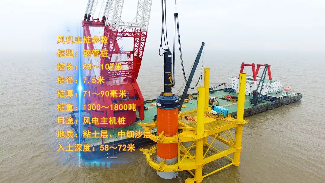风电主桩由运输船运至现场,用起重船吊至辅助定位平台指定位置,本项目主桩桩长83~102米,直径7.5米,桩重:1300~1800吨,入土深度达58~72米。永安机械YC-180液压冲击锤,作为突破国外垄断的标志性超大型设备,本项目使用最新升级的第二代产品,配备两台双联动2600P动力站,锤芯180吨,配备7.5米直径桩帽,最大打击能力3060千焦,锤击能量大,可靠耐用、操控方便、维保便利,经过现场多方通力合作,顺利将风电主桩打至指定标位。