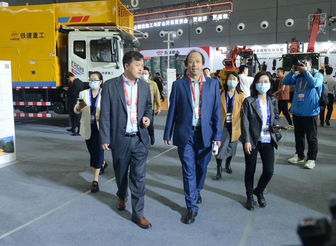 第十四届全国政协常委、中国工程院院士杨华勇参观铁建重工展台,铁建重工党委副书记、董事、总经理赵晖,副总经理刘丹陪同讲解