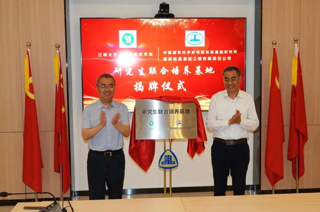 建研地基总经理吴春秋和三峡大学土木与建筑学院执行院长邓华锋分别代表双方签署了战略合作协议;建研地基董事长高文生和三峡大学土木与建筑学院党委书记张国栋共同为“研究生联合培养基地”揭牌;并举行了三峡大学校外兼职教授和硕士研究生行业导师的聘书颁发仪式。