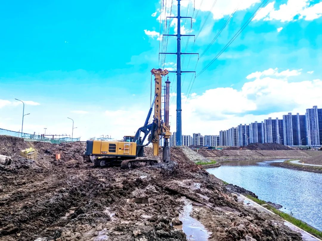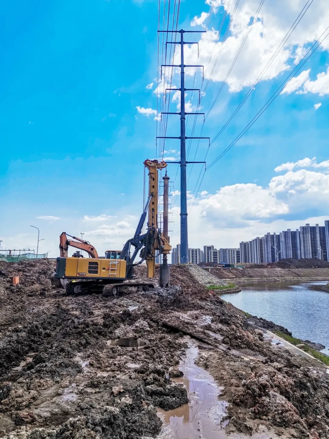在限高10米的高压电线下,徐工全新国四XR138F低净空旋挖钻机轰鸣作响,钻杆不断提拉下放进行管廊支护桩施工。