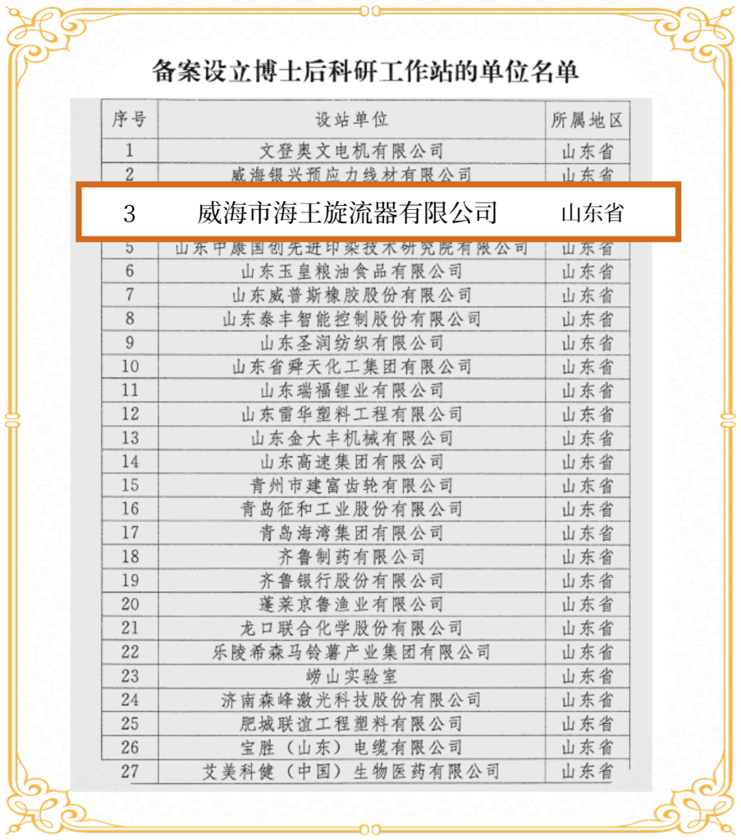近日,国家人力资源社会保障部、全国博士后管理委员会办公室发布《关于开展2022年博士后科研工作站新设站工作的通知》威海市海王旋流器有限公司榜上有名,成功获批为国家级博士后科研工作站,标志公司在高层次人才联合培养、科研平台建设上取得重大突破。