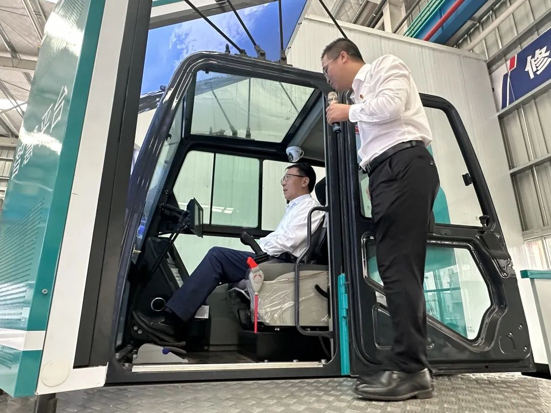 沿着习近平总书记考察山河智能的路线,梁宝俊一行首先来到挖掘机装配车间,重温了总书记的重要讲话精神。在这里,何清华向梁宝俊一行介绍了山河智能先进制造、高端产品、智能仓储等方面的情况,随后,大家一起观看了中国联通与山河智能的合作纪录视频,进一步了解了双方在5G工业互联网应用场景落地、工程化应用等方面的合作成果。梁宝俊对山河智能的高端产品以及双方在5G工业互联网应用方面取得的成绩赞叹不已。