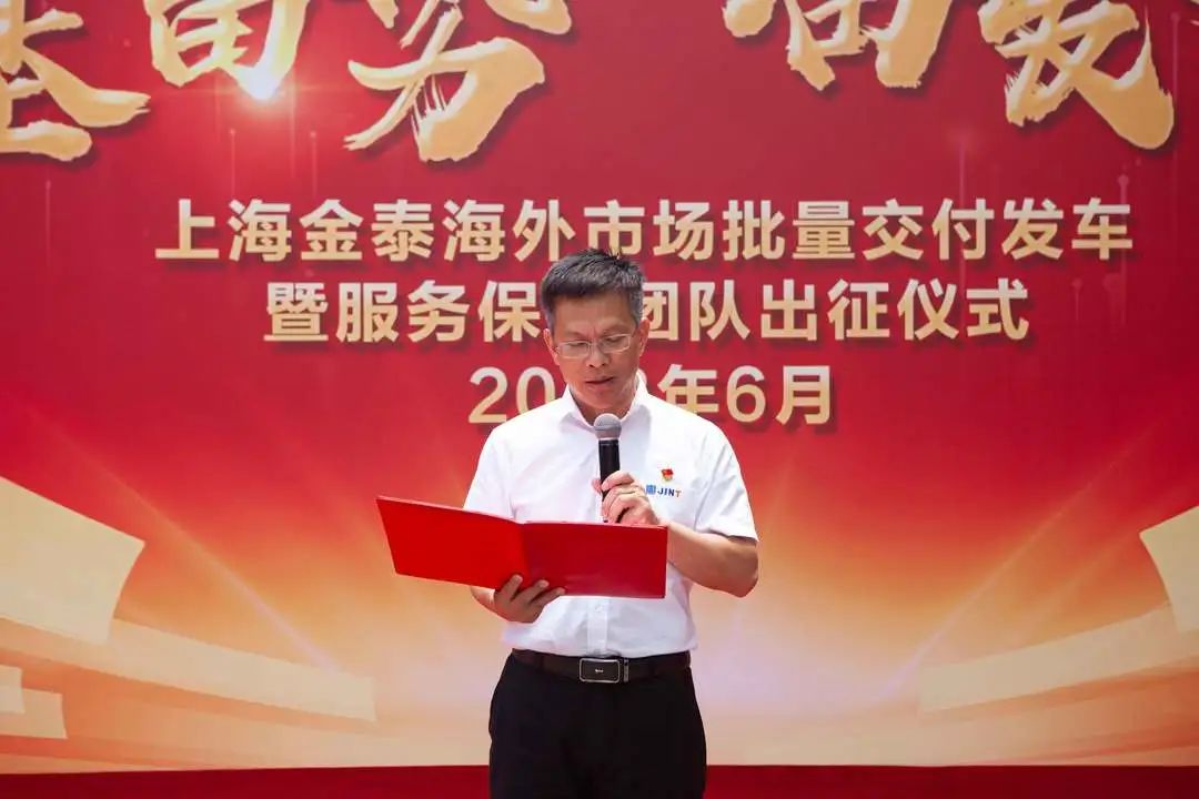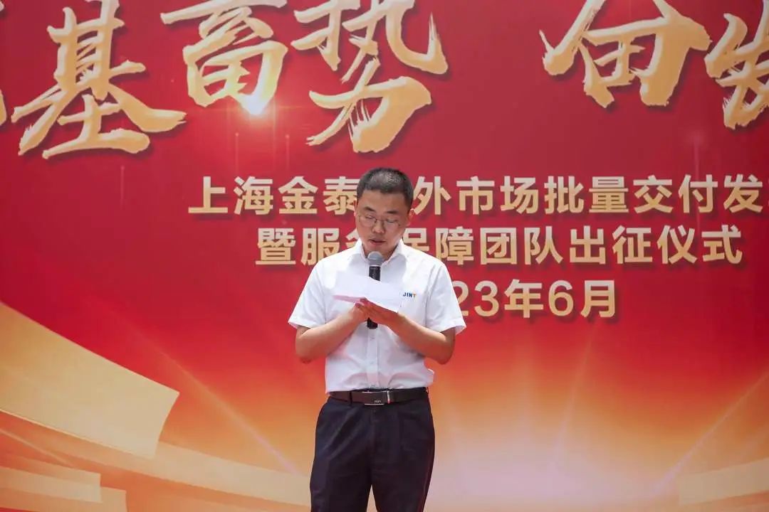 6月20日上午11时,“2023上海金泰海外市场批量交付发车暨服务保障团队出征仪式”于上海安亭洛浦路45号金泰本部隆重举行。一辆辆满载主机、附件和钻具以及现场保障用品备件的卡车从金泰本部驶向港口,奔赴中东、北美、澳洲、南亚、俄罗斯等国家和地区,为上半年的收官工作再敲重锤。上海金泰总经理黎隶万、党委书记陈雪英、董事副总经理徐峰等公司主要领导以及生产、研发、营销等各部门代表共同参加见证。