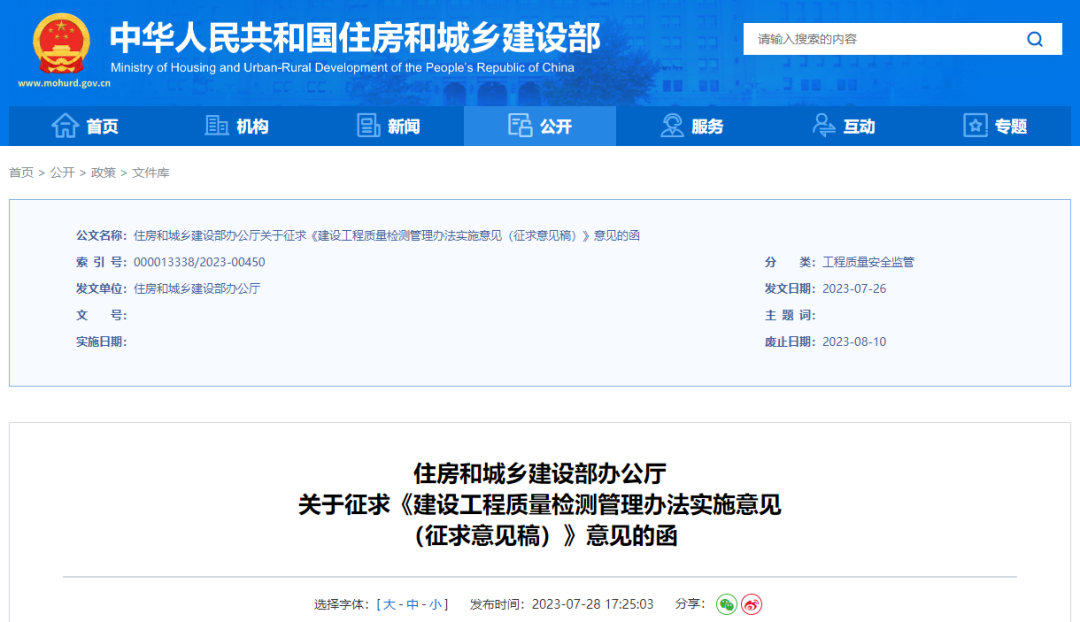 为贯彻落实《建设工程质量检测管理办法》(住房和城乡建设部令第57号)和《建设工程质量检测机构资质标准》(建质规〔2023〕1号),加强建设工程质量检测管理,推动建设工程质量检测行业健康有序发展,我部研究起草了《建设工程质量检测管理办法实施意见(征求意见稿)》(见附件),现向社会公开征求意见。有关单位或个人可于2023年8月10日前通过以下途径和方式提出反馈意见: