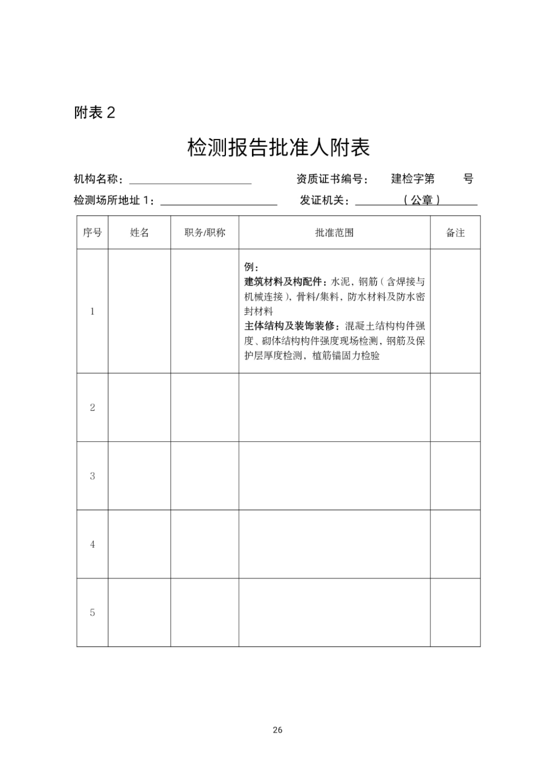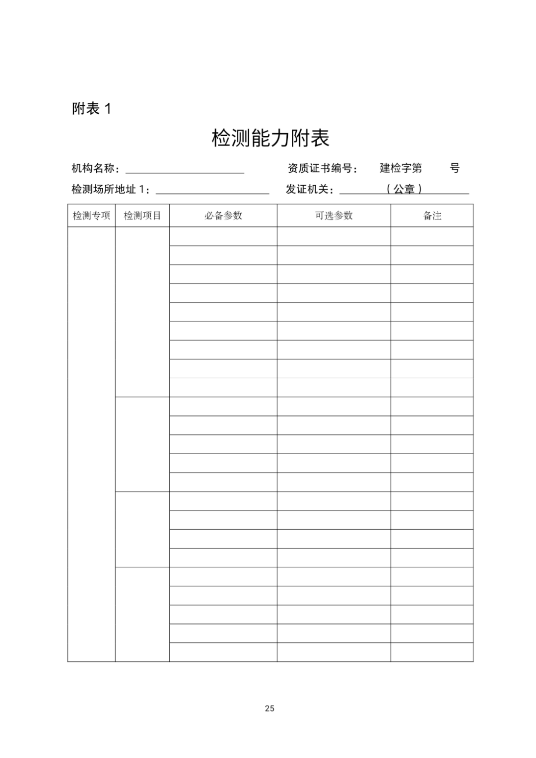 (二十五)资质许可机关可结合地方实际,根据《办法》规定的检测业务范围,按照最新的工程建设标准规范要求,适当增减《资质标准》附件2中的可选检测项目或可选检测参数。
