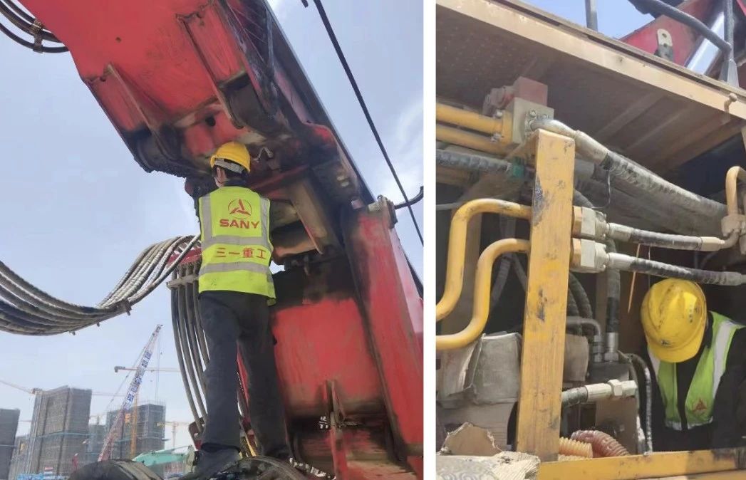 2022年7月,客户购买三一桩机首批SR275,设备在开工时间前一天晚上才到工地,黄夏辉和同事们连夜为客户组装好设备,在工地开工仪式前顺利完成设备全部组装与调试!为确保275首桩成功,完成调试后黄夏辉和同事们就在服务车上休息,直至设备正常施工。打试桩期间,由于新来机手对地层不熟悉,导致塌孔,黄夏辉利用公司AR技术,现场连线研究院工法工程师,现场远程指导机手完成试桩,确保首批275设备交付顺利!为国四275奠定良好基础。客户非常认可,之后也陆续购买4台三一旋挖。