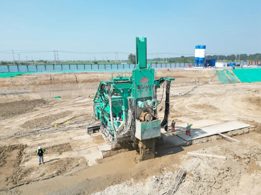 “上工机械TRD工法机是真有劲,现场主要为白沟引河(毗邻隧道部分河道被荒地、农田及绿化带所填埋),地质情况复杂,上工的设备总是能很轻松的应对自如,墙体深度27-40m,先行掘进速度2m-3m/h,回撤挖掘速度8m/h,成墙搅拌速度2.4m/h的。”每天将近20个小时的工作时长,设备不停、故障率很低,人员两班倒,成墙方量多,现场机手师傅竖起大拇指称赞道,“没说的,用上工设备我们放心。”