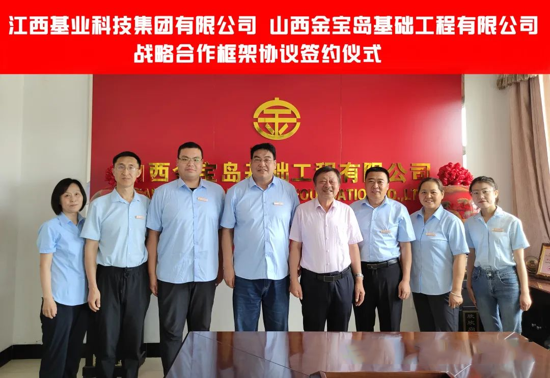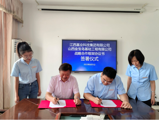 2023年8月5日上午,江西基业科技集团有限公司(后简称江西基业)与山西金宝岛基础工程有限公司战略合作框架协议签约仪式在太原举行,山西金宝岛常务副总董宝志主持会议,董事长文哲与江西基业董事长刘献刚代表双方签字。山西金宝岛技术部、行政人事部、生产安全部及财务部等部门代表参加了签约仪式。