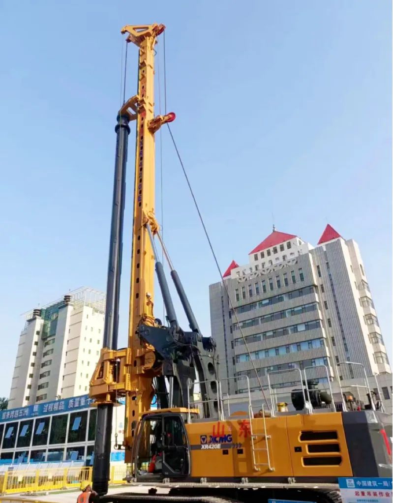 XR420E旋挖钻机率先施工钻进进行引孔,徐工连续墙液压抓斗抓取一定深度后,硬岩地层由徐工双轮铣进行铣削,成套化施工效率最大化!
