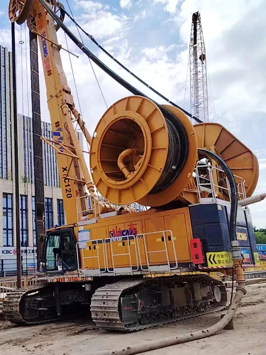 徐工技术人员和项目人员通过全面调研分析,为项目选型出谋划策,动态调整施工工序,最终采用徐工XR420E旋挖钻机、XG700E地下连续墙液压抓斗、XTC120双轮铣槽机联袂出击,配合旋挖钻引孔+抓斗抓取+铣槽机铣削岩层的工法,三台徐工桩工机械进行“流水”作业。