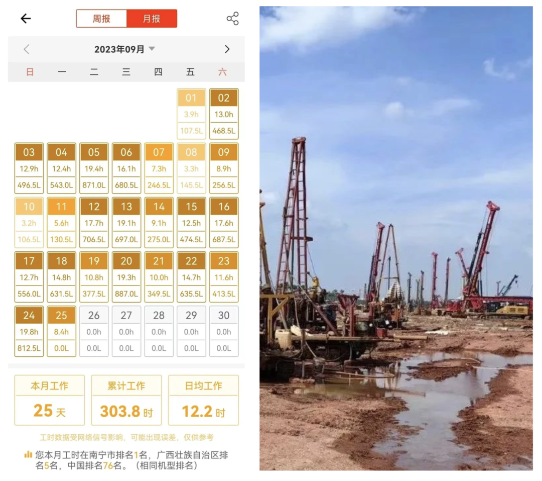 工地现场情况:地层是上面4-5米土层,下面全是岩层,桩深要求15米,1台三一SR405设备一天可打3根桩,油耗大概在33.34L/h。