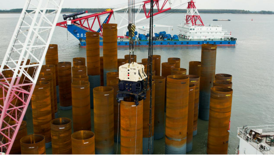 翻桩器是永安机械针对超大直径钢管桩翻桩问题研发的新产品,针对海上风电翻桩耗时长,受海况影响因素多等因素,并在液压振动锤夹具系统的基础上,创新研发的一款热门海上风电产品。目前永安机械拥有的翻桩器型号由FZQ-100至FZQ-1200,可翻桩直径1m到12m,重量100t至1200t的钢管桩,并且可以与永安机械动力站配套通用。永安机械翻桩器采用高强度钢材,经过严格的热处理工序,并用高精度数控中心加工而成,夹具使用合金钢,焊接结构件符合CCS编制的《船舶与海上设施起重设备规范》2007版中“重要起重零部件”设计与焊接规范。