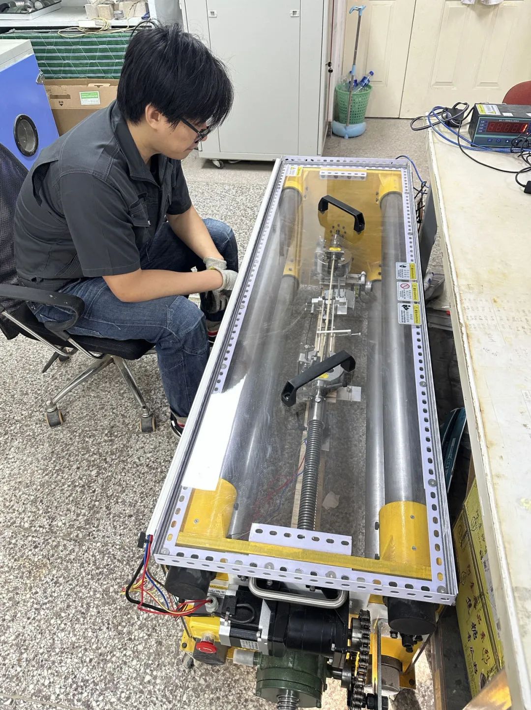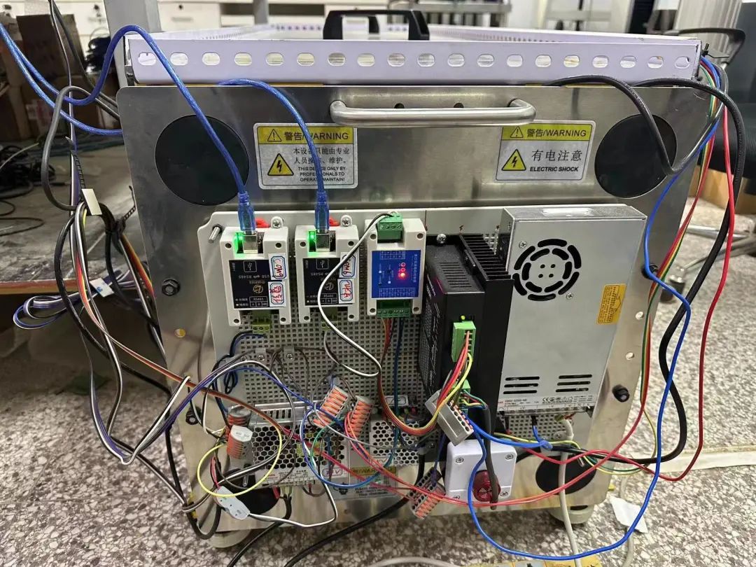 课题需要研究“竹材在顺纹拉伸状态下的应力松弛”问题。鉴于目前国内尚无研究竹材应力松弛特性的试验机,课题组的研究生郭敬一依托地基实验室的科研条件,在导师的指导和实验室工作人员的配合下,自主研发、设计、制造了一台“应力松弛试验机”。该试验机中部设有托承系统,两端分别为动力模块和通信模块。测控程序采用Python3编写,并以“RS485串行通信标准+Modbus报文传输协议”的形式实现主机与各传感器、控制器的通讯。