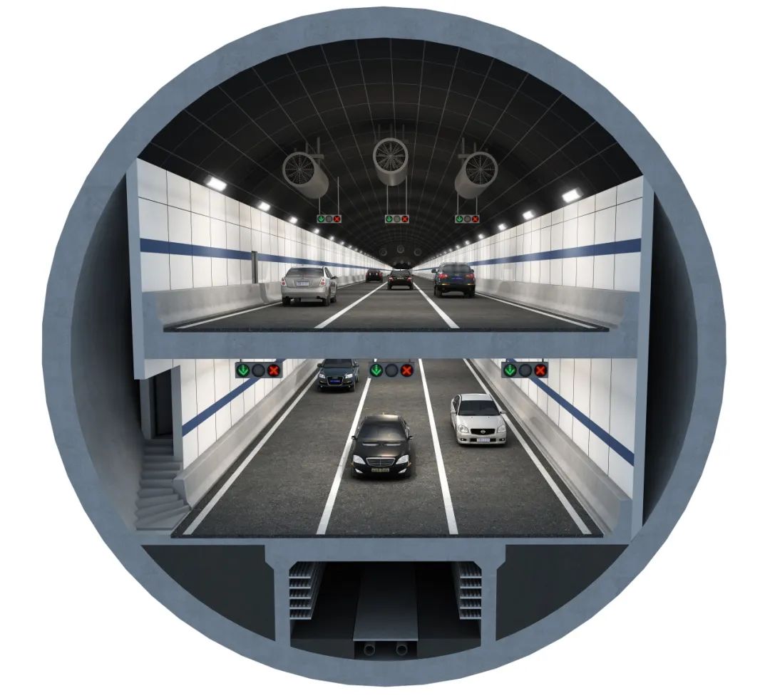 面对复杂的建设条件,该工程首次采用单管双层双向六车道盾构断面,创新采用了上下层共用横向排烟道的横断面设计方案。