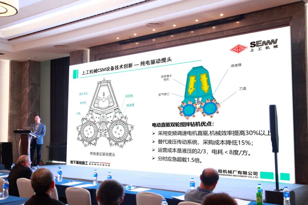 报告首先对CSM设备技术进行概述,上工机械MS45双轮搅钻机产品采用纯电驱动、变频调速电机直驱效率高、运行成本低、替代液压传动系统、采购成本低,运营成本是液压的2/3,电耗低至8度/方,分时应急超载1.5倍,电机强制冷却技术等多方面技术创新点,然后对CSM设备技术创新—钻杆组合,将传统CSM的浆管、气管、冷却液管和黄油管路由软管变成硬管集成在钻杆中,大大提高钻杆拼接效率等先进技术进行阐述介绍。