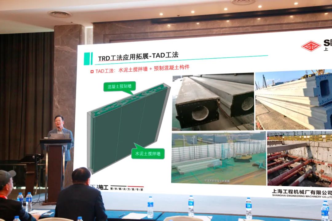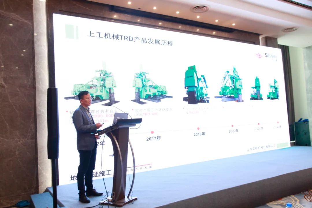 作为匠心传承,百年企业,大会特邀嘉宾--上海工程机械厂有限公司总经理龚秀刚出席会议开幕式,现场以《TRD工法设备的研发和应用》项目荣获茅以升岩土工程技术创新奖-团队奖,并受邀在茅以升奖论坛上以“等厚度水泥土搅拌墙施工设备研发和应用”为题,围绕“等厚水泥土搅拌墙工法介绍、CSM、TRD设备技术创新、TRD典型应用案例”等技术专题做会议报告。