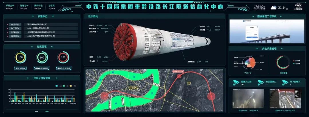项目依托“两站、两院、一室、一会”为一体的技术研发平台,构建信息化综合管理平台,涵盖了参建单位、进度管理、设备及维保管理、数字盾构、国铁集团工管系统、安全及质量管理6大模块的内容。
