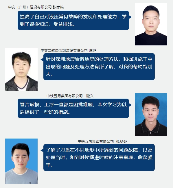 课程涵盖盾构施工管理、地层地质、设备等基础内容,管片破损、螺旋机卡机、岩溶、刀盘异常磨损等施工问题还有仿真模拟机操作、真机电气液压模拟排故,学员都反馈收获满满。