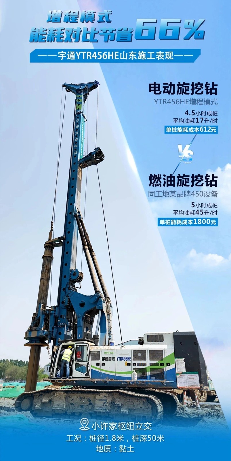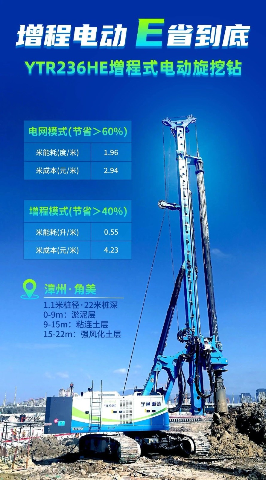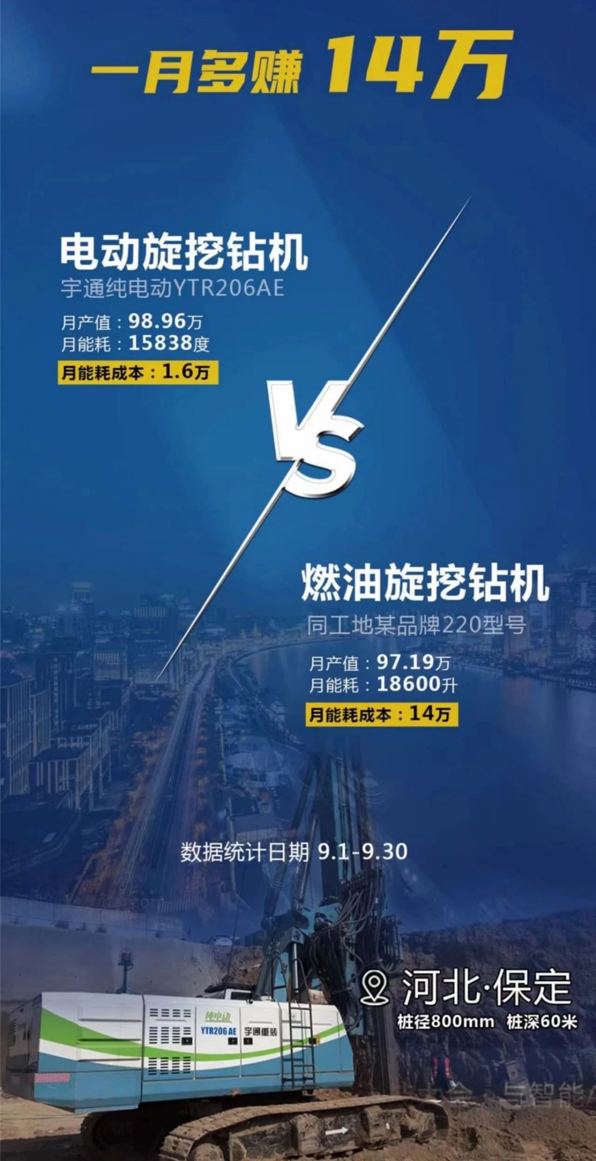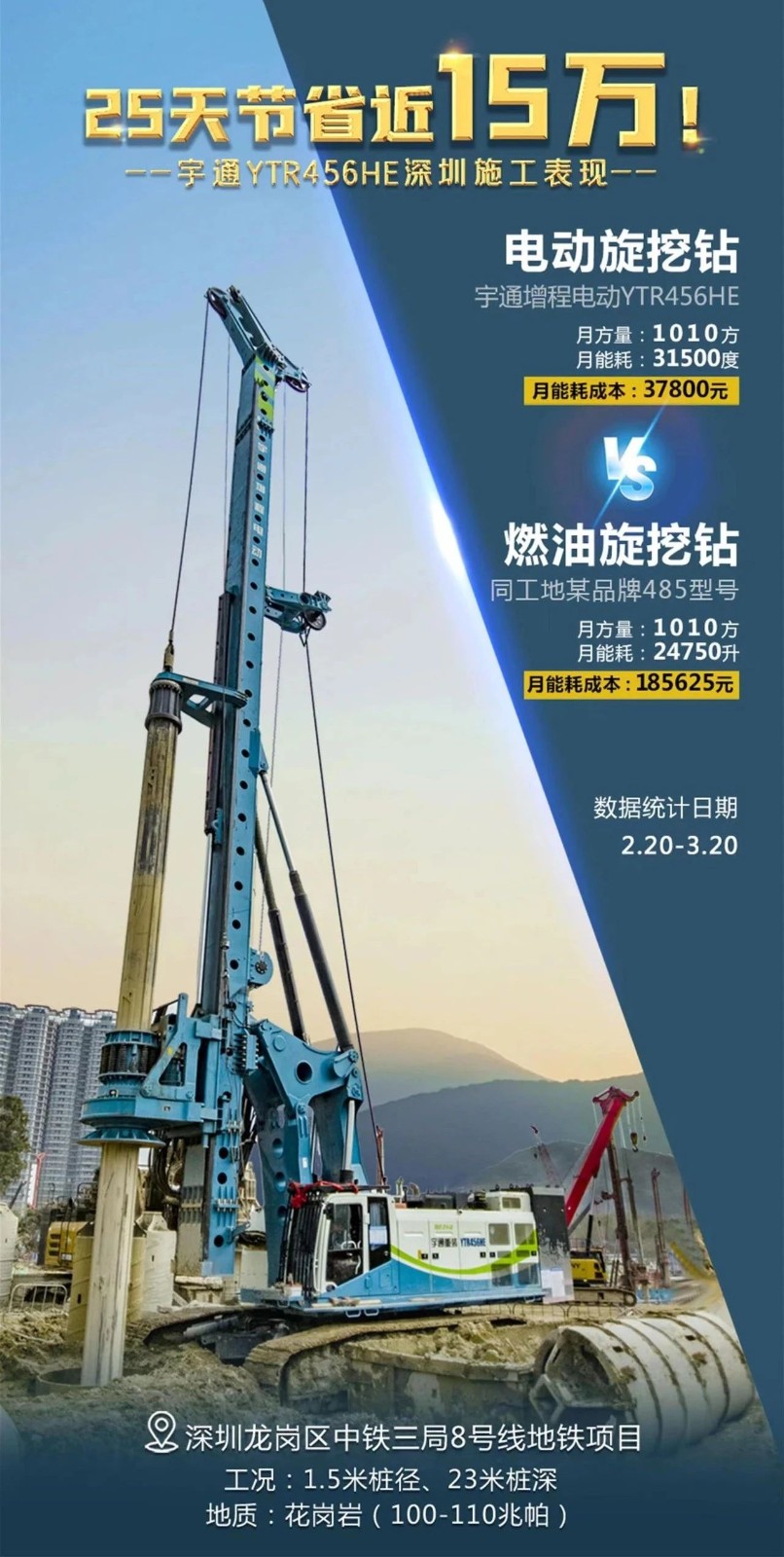 自2020年宇通重装推出电动旋挖钻机,已累计在河南省、河北省、山东省、山西省、陕西省、四川省、贵州省、浙江省、广东省、福建省等全国20多个省市施工,纯电模式节能70%-80%,增程模式节省40%-50%。不管哪个省,电动旋挖帮您省!