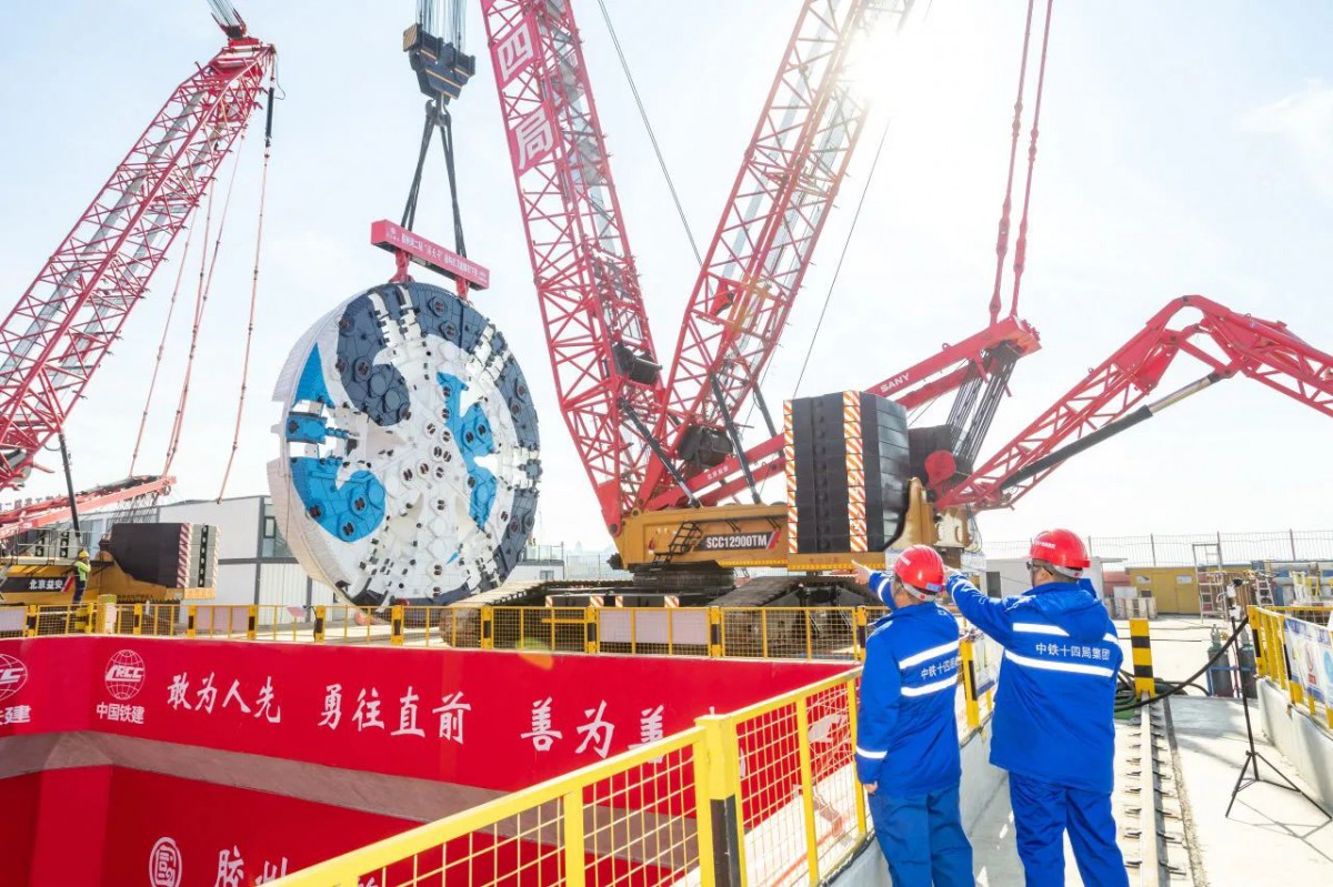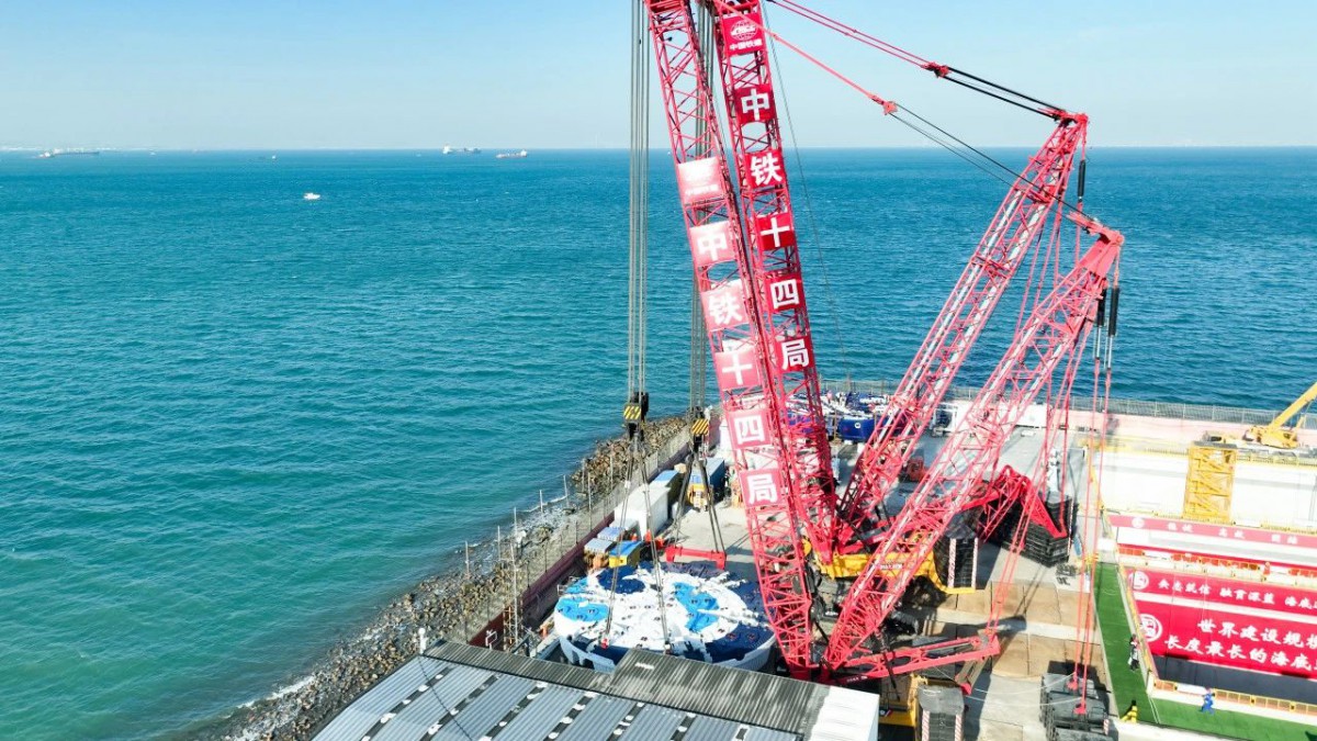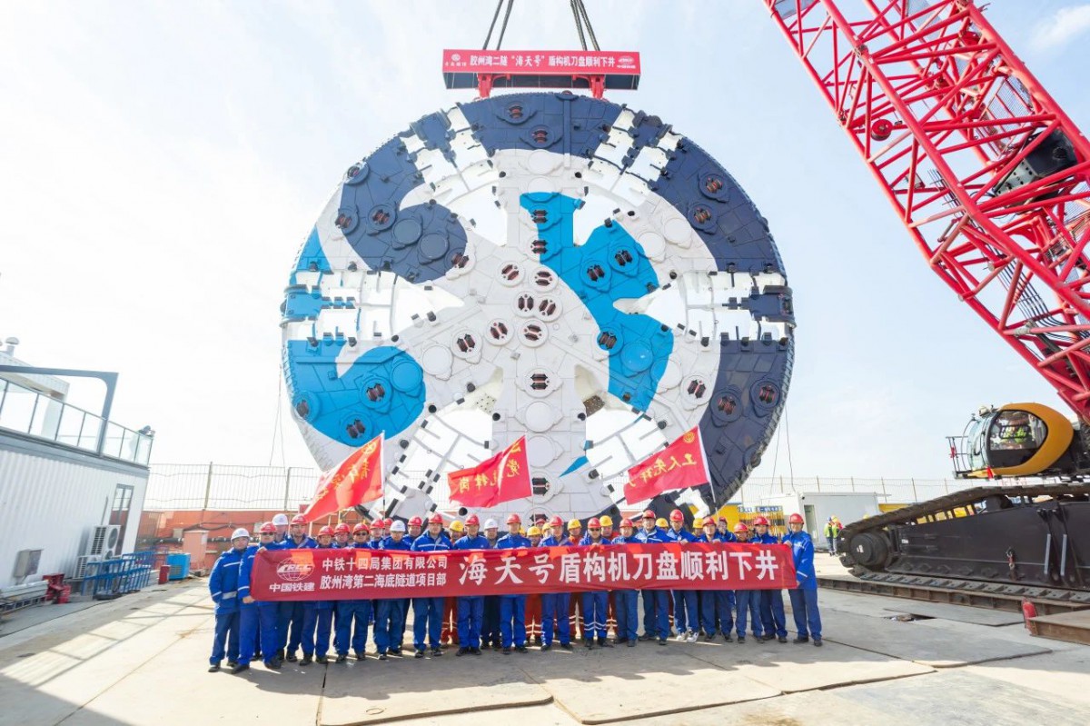 11月13日,随着履带吊缓缓下放,重达600吨的刀盘和主驱动稳稳契合,由中铁十四局承建的世界上建设规模最大、最长的海底公路隧道——青岛胶州湾第二隧道“海天号”盾构机刀盘顺利吊装下井。