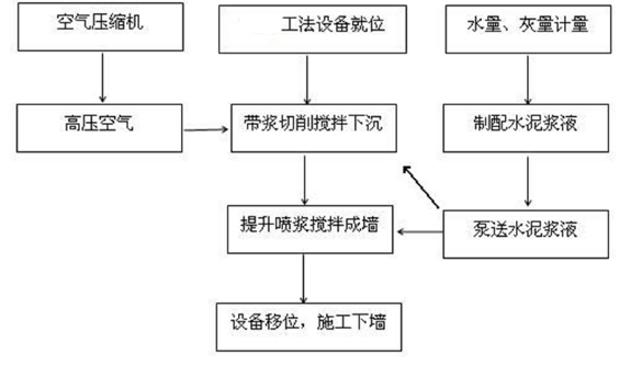 主要包括:清场备料→测量放线→安装调试→开沟铺板→移机定位 →铣、削下沉搅拌、喷浆→回转提升喷浆→成墙移机→插入H型钢桩