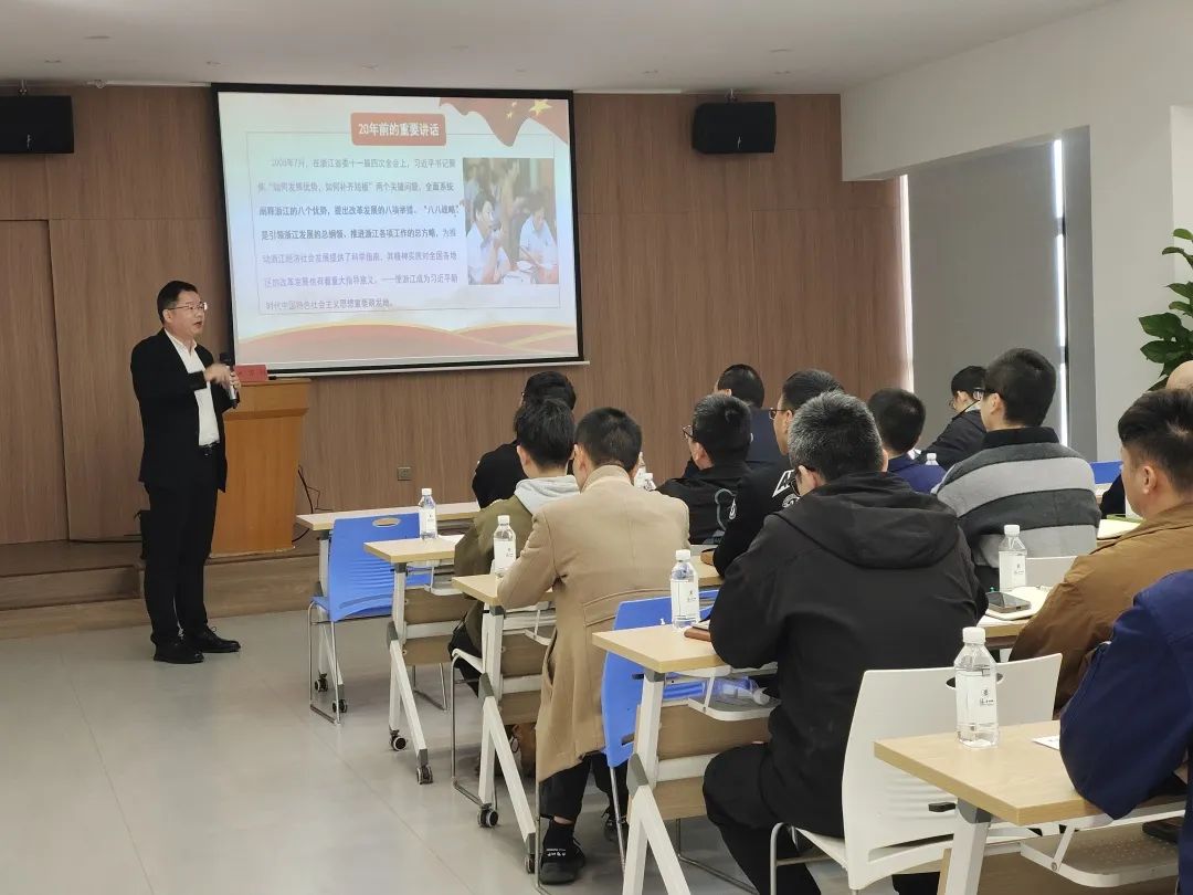 池老师讲座主题是:学重要讲话,促“两个先行”———持续推动“八八战略”主题教育走深走实。池老师紧紧围绕“八八战略”诞生和实践轨迹做了重点论述,对什么是“两个先行”,什么是“八八战略”作了详细解读,特别对“八八战略”的八个优势、八项举措”以及“八八战略”实施20年, 推动浙江大地精彩蝶变等做了完美的诠释。