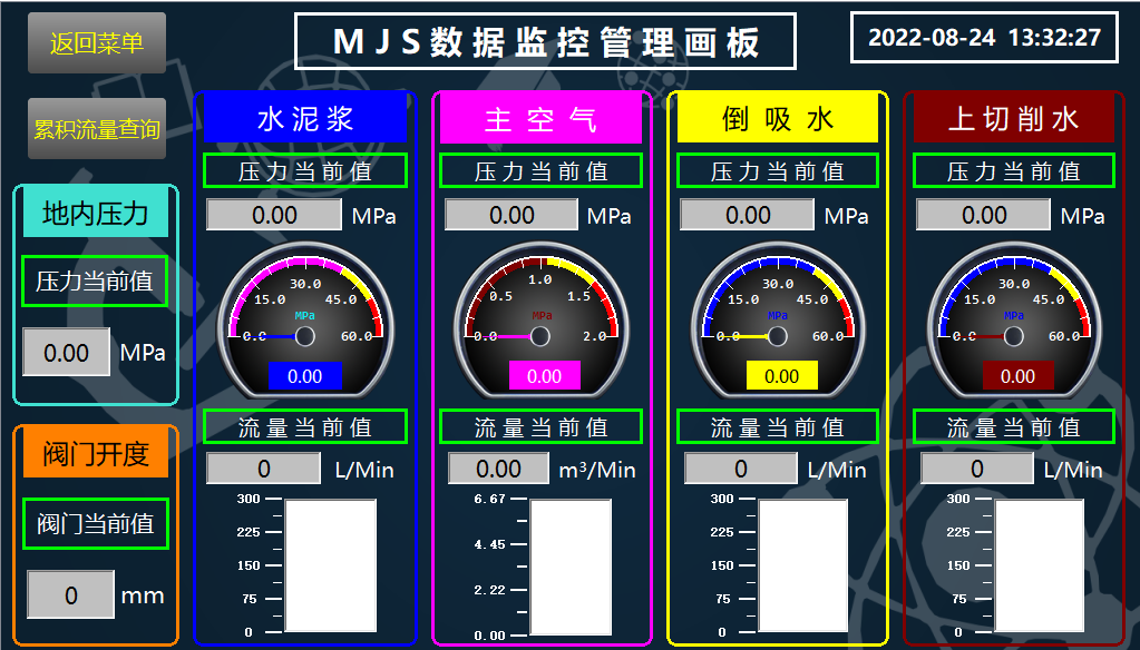 进入MJS数据监控管理面板,显示水泥浆、主空气,倒吸水,上切削水的“压力当前值”和“流量当前值”,同时还显示出地内压力值和阀门开度。