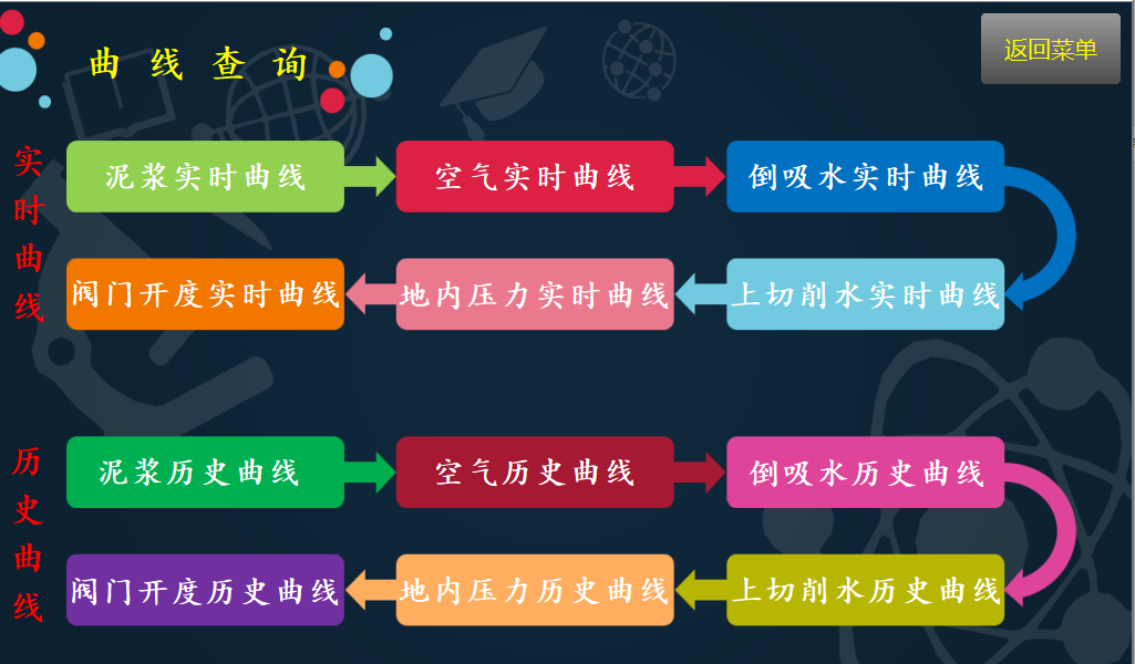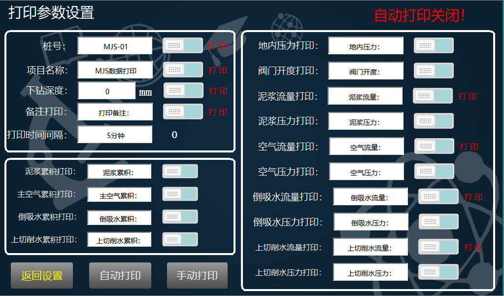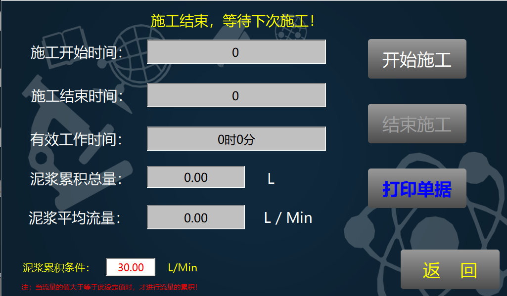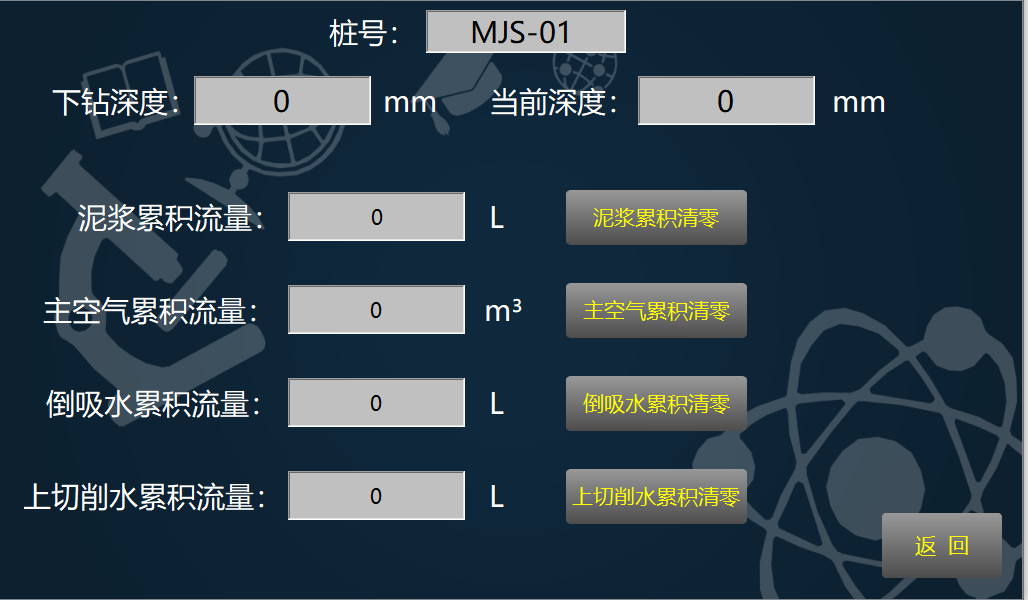 进入监控画面,显示桩号,下钻深度,当前深度,泥浆累积流量,主空气累积流量,倒吸水累积流量,上切削水累积流量,可查询累计流量。