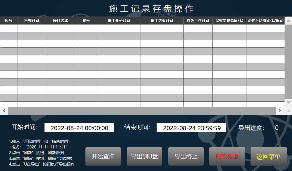 进入数据导出界面,可导出数据明细和施工记录等信息。