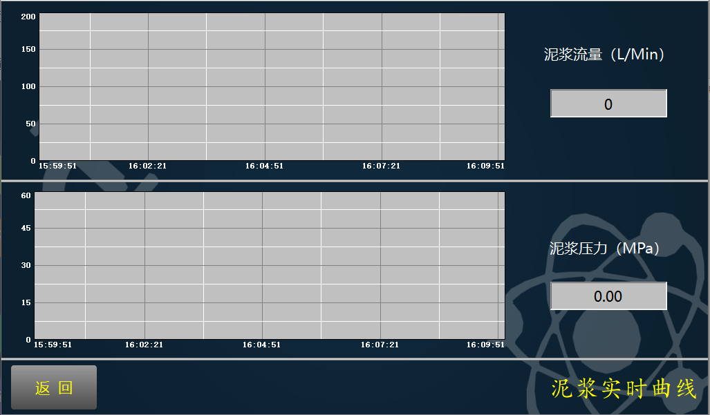 该页面为泥浆流量和压力的实时/历史曲线,页面的上半部分为泥浆流量的实时/历史曲线,页面的下半部分为泥浆压力的实时/历史曲线。