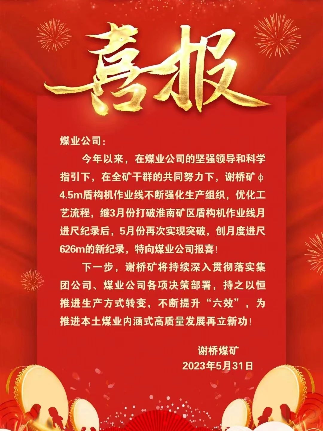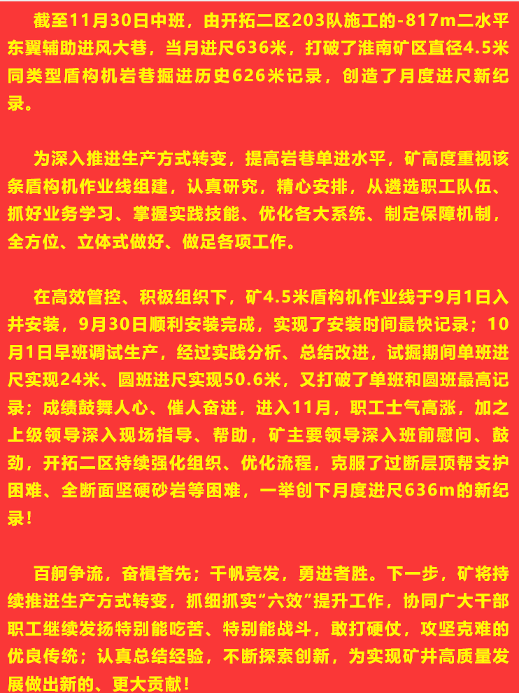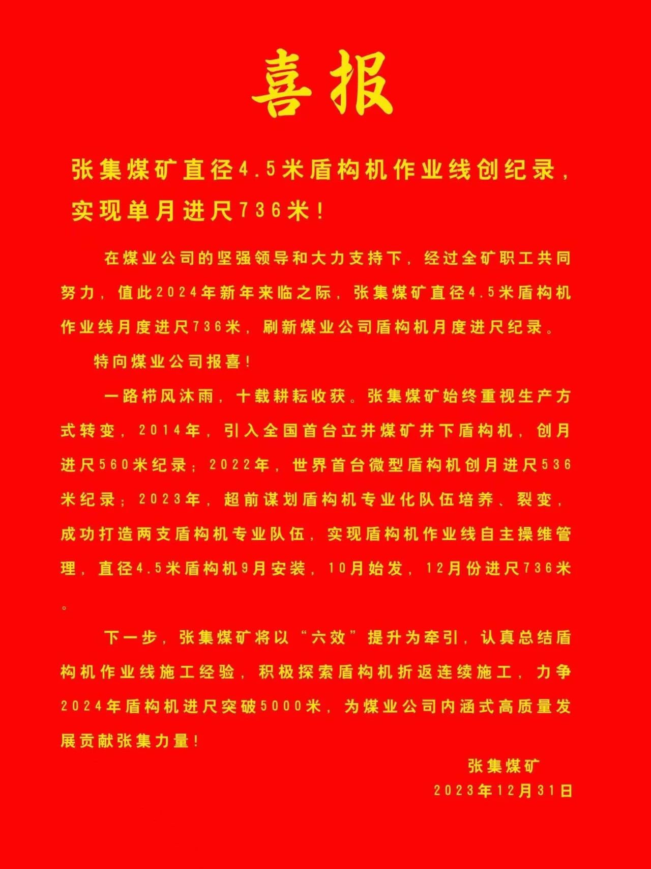 据悉,“圭遁二号”于2023年10月始发,12月便以月进尺736米一举拿下了淮南矿业集团煤业公司全系列产品月进尺的最高纪录,并刷新全国纪录。