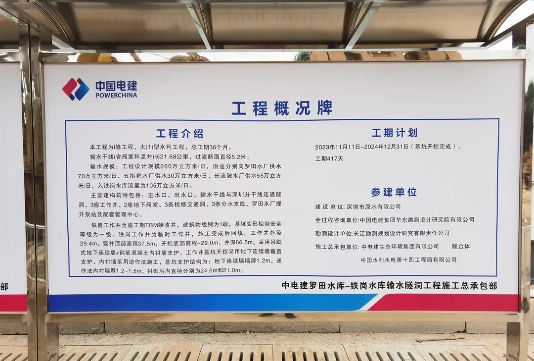 罗田水库-铁岗工作井是珠江三角洲水资源配置工程在深圳境内的配套项目,是实现深圳东西江水双向调配、双水源、双安全供水布局的关键工程。供水覆盖范围包括宝安区、南山区近600平方公里土地,服务600余万常住人口,支撑超一万亿元地区生产总值。该工程总投资为58.023亿元。输水干线长21.68公里,过流断面直径5.2m。