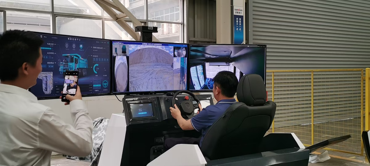 紧接着,大家来到了山河智能“5G超视距远程遥控”展示区,在展示区内各企业单位领导亲自体验了基于数字孪生技术的高临场感5G遥控仿真培训平台,无人矿卡5G应急接管系统,智能钻机5G远程遥控舱等相关遥控产品,详细了解了各项功能,对山河智能的先导式创新称赞不已。