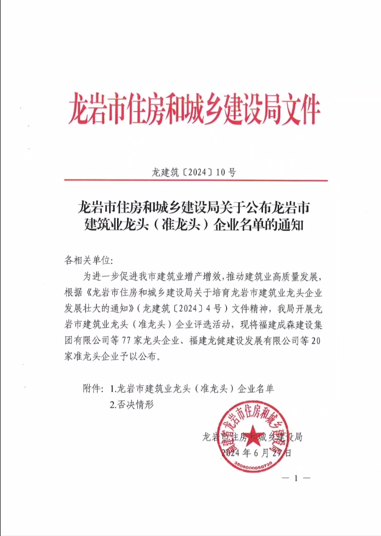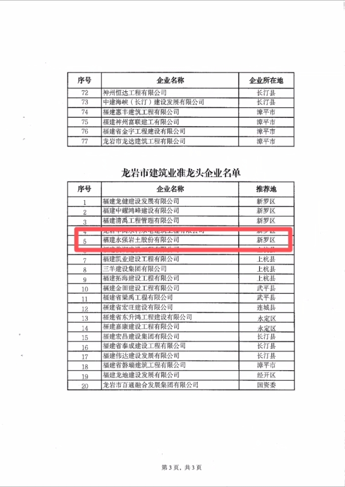 近日,龙岩市住房和城乡建设局发布龙岩市建筑业龙头(准龙头)企业名单,永强岩土成功入选龙岩市建筑业(准龙头)企业名单。