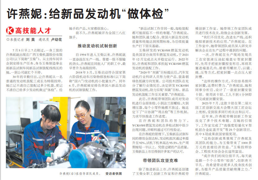 除了推进新品上市,许燕妮还创建了玉柴女职工创新工作室和许燕妮劳模创新工作室。她带领工作室团队成员进行技术攻关,助推企业创新发展。