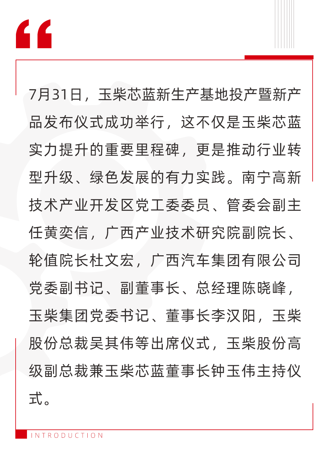 李汉阳在致辞时表示,玉柴从2004年开始进行新能源产品开发,至今已投入超10亿元,形成了300多项核心专利,新生产基地的投产是玉柴新能源动力从产品开发到市场投放的重要转变。新能源动力板块是玉柴的战略板块,也是未来重要的增长极,玉柴集团将全力支持玉柴芯蓝做强做大,希望玉柴芯蓝继续深化技术创新,优化生产流程,提升产品质量,为全球客户提供品质卓越的新能源产品,助力客户成功。