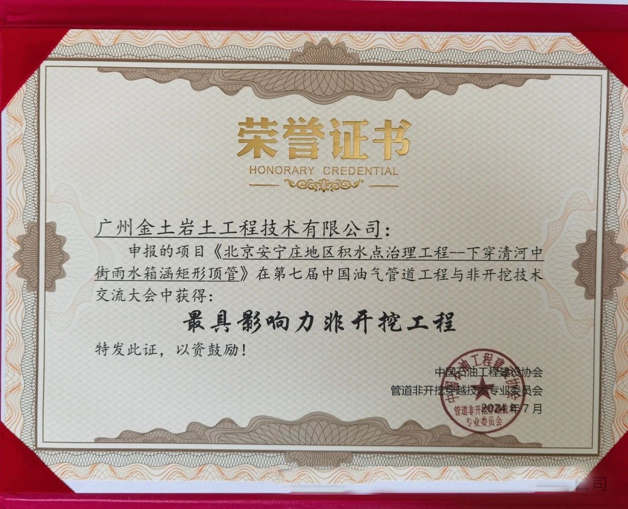 广州金土岩土工程技术有限公司申报的《北京安宁庄地区积水点治理工程——下穿清河中街雨水箱涵矩形顶管》项目荣获最具影响力非开挖工程