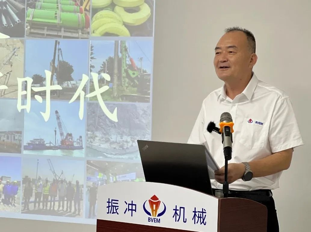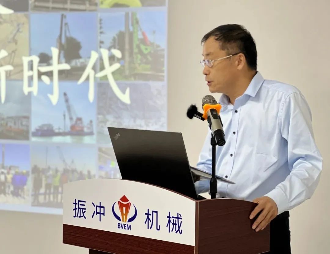 振冲机械总经理张广彪先生在发言中深刻阐述了振冲新工法的创新内核与市场潜力,强调企业蓬勃向上的强劲动力与坚定信念。