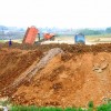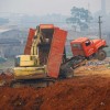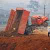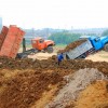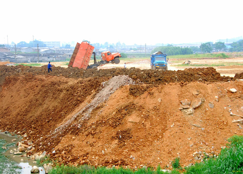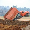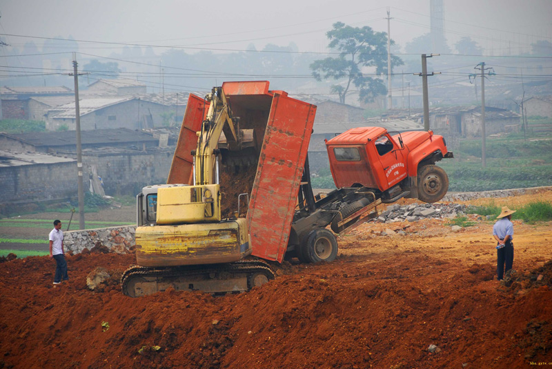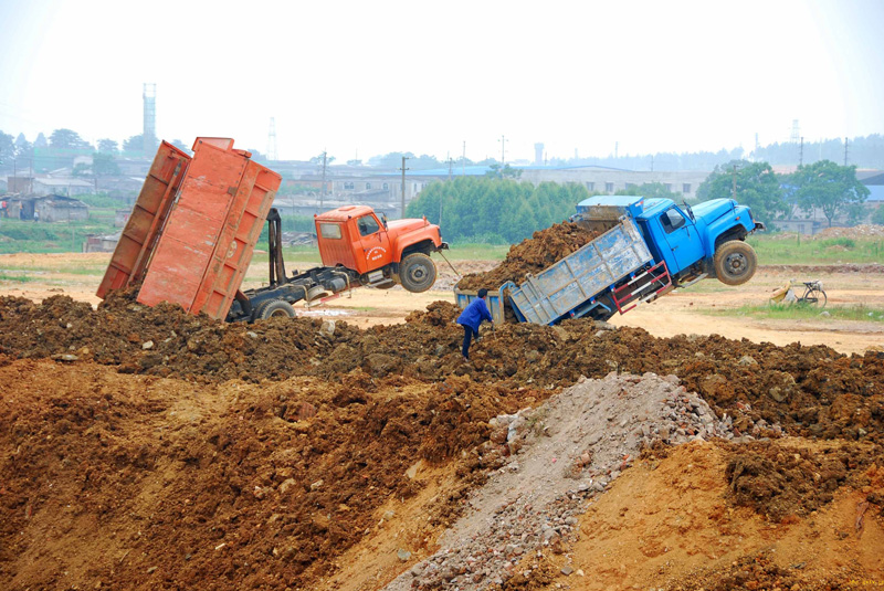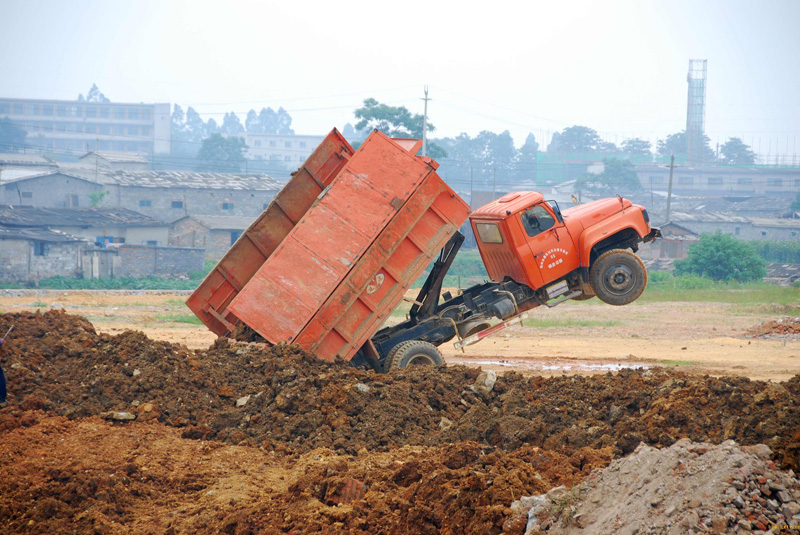 在一个填土的工地,好几辆翻斗车在倒土,先后有几辆车的车头翘起来,好像是由于倒土的时候泥土下滑后,司机操作不当,配合不到位,汽车没有及时开走,还有半车多的泥土压倒车尾,重心后移,造成车头翘起来,动弹不得,司机坐在翘起的驾驶室里也无能为力,只好让在一旁的挖掘机把车上的泥土扒下来,再顶上一把才得以解脱,曾经有一辆车还翘在哪里,接着又开来一辆车倒土,结果两辆车同时翘起来,成了哪里的一道独特的风景。