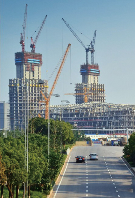 2012年4月26日,青奥双塔楼正式动工。该工程地下3层,其中A塔楼地上58层、高255米,B塔楼地上68层、高314.5米,裙房5层,总建筑面积28.7万平方米。作为青奥轴线上的标志性建筑,南京青奥中心双塔楼能否在青奥会开幕前封闭外幕墙,形成美轮美奂的外观造型,事关南京的城市形象。