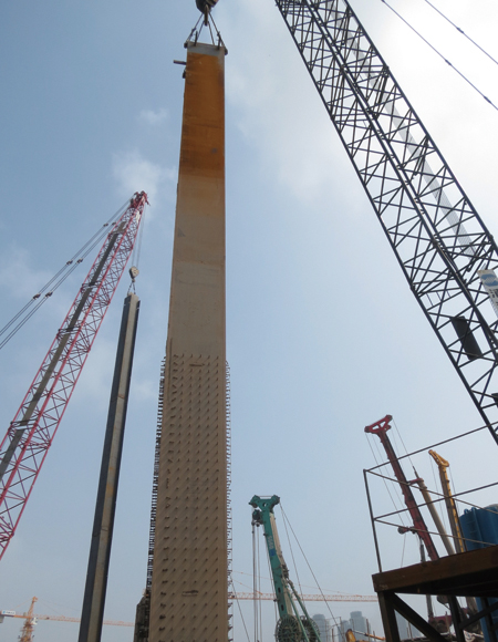 “一般的建筑是主楼顺作,裙房逆作,而南京青奥中心双塔主楼、裙房(共一个地下室)‘全逆作’,这在全球建筑史上都是史无先例的。”据项目经理朱惠清介绍,项目首先进行桩基地连墙的施工,作为整座塔楼的基础,最大桩径达3米,最深至地下90多米,相当于往地下挖一个30多层的高楼,超过一半的工程桩还下插垂直精度要求达1/500的钢柱;地连墙作为整个地下室的围护结构,最深达60多米。