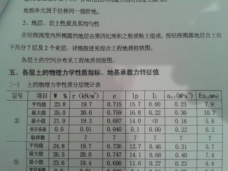 另外有关地层岩性及土的物理力学性质的内容可以不看。这些内容和设计关联不大,比如含水量、土的密度、土的孔隙比e和空隙率n、土的饱和度S、土的干密度、饱和密度、有效密度、抗剪强度指标、缩限WL、土的塑性指数IP、土的液性指数IL等,都可以不看。土的压缩性指标中的压缩模量Es,过去在基础设计手算地基变形时也许要用到,但现在大量使用对应的JCCAD软件,Es也逐渐淡出了。
