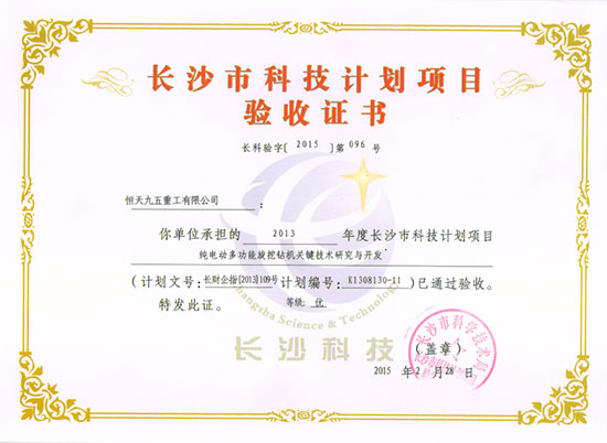 核心提示: 近日,恒天九五重工有限公司承担的2013年度长沙市科技计划重点项目:《纯电动多功能旋挖钻机关键技术研究与开发》,以优等通