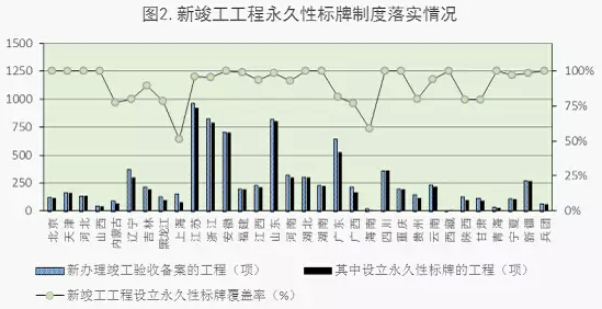 2015年4月,全国新办理竣工验收备案工程8474项,其中有7868项工程设立永久性标牌,覆盖率为92.81%,较3月份提高约2个百分点,安徽、四川、湖北等11个省(区、市)和新疆生产建设兵团覆盖率达到100%;有6654项工程建立质量信用档案,覆盖率为78.52%,较2月份提高约5个百分点,安徽、湖南、重庆等8个省(市)覆盖率达100%。