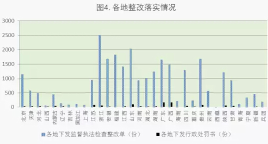 各地共下发监督执法检查整改单26783份、行政处罚书1230份,处罚相关单位903个,处罚相关人员377名,实施信用惩戒968起,曝光违法违规典型案例442起。从行政处罚数量看,广西、广东、山东3个省处罚力度较大;从曝光典型案例数量看,云南、天津、重庆3个省(市)曝光力度较大。